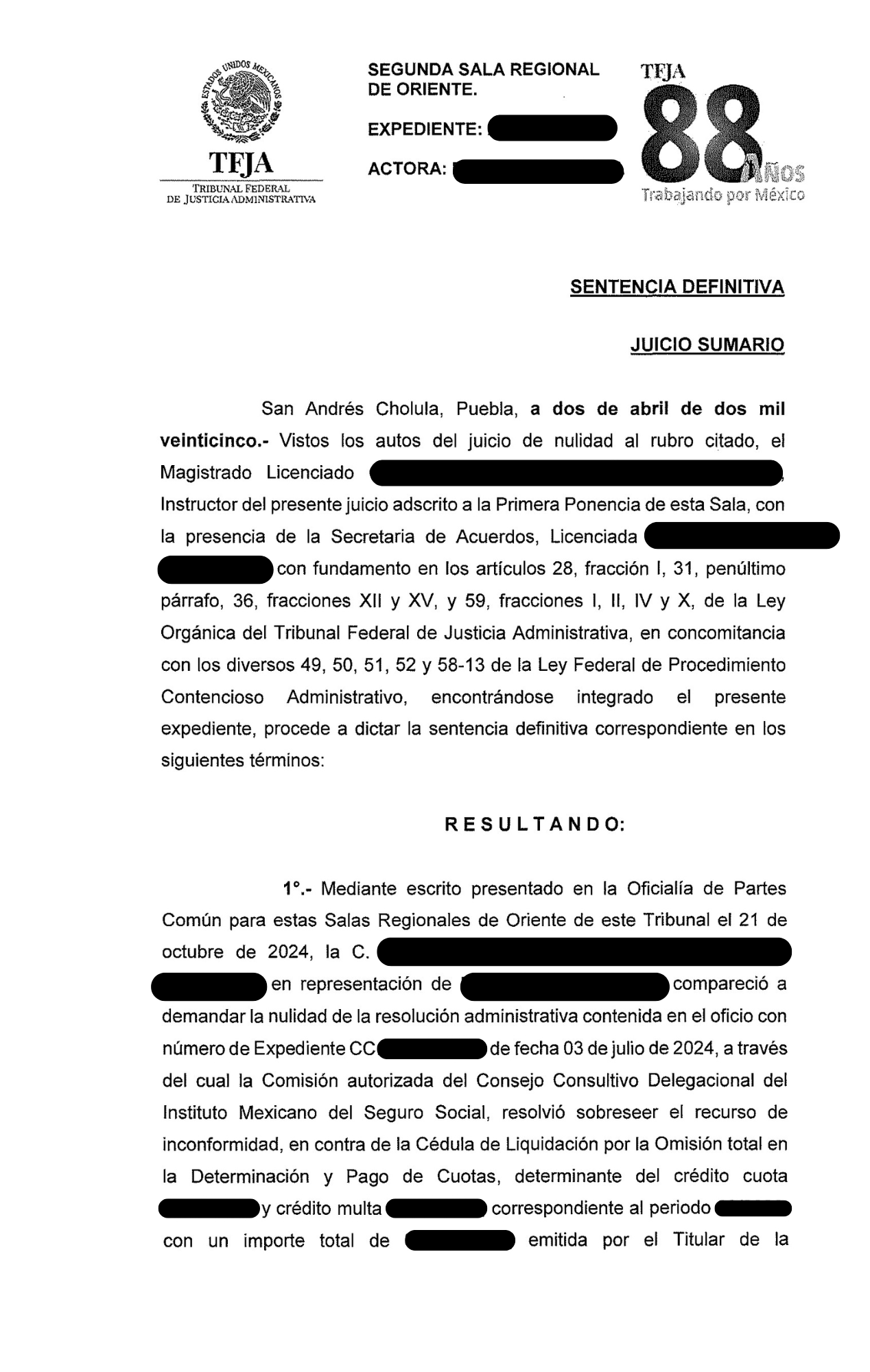 Resumen de la Resolución y Determinación de la Autoridad:La C. Representante Legal, actuando en nombre de la empresa "LA EMPRESA RECURRENTE, S.A. DE C.V.", interpuso un recurso de inconformidad contra una cédula de liquidación por omisión en el pago de cuotas obrero-patronales del periodo 09/2020, por un importe total de $------------ (crédito cuota XXXXXXXX1 y crédito multa XXXXXXXX2), emitida por ---------------------.