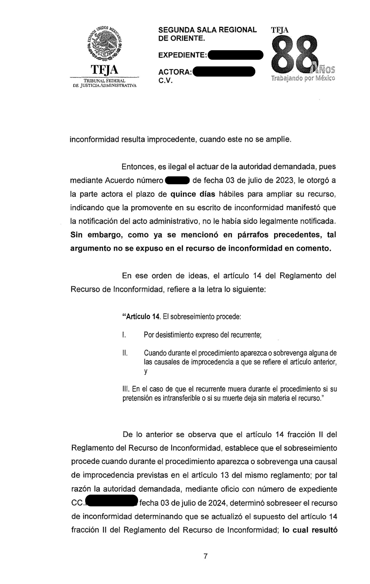 Resultado (Desarrollo):Fundamentación:La autoridad cita como fundamentos principales para el sobreseimiento el artículo 13, último párrafo, y el artículo 14, fracción II, del Reglamento del Recurso de Inconformidad.
