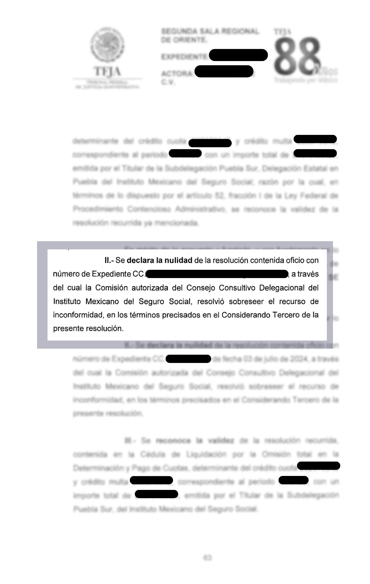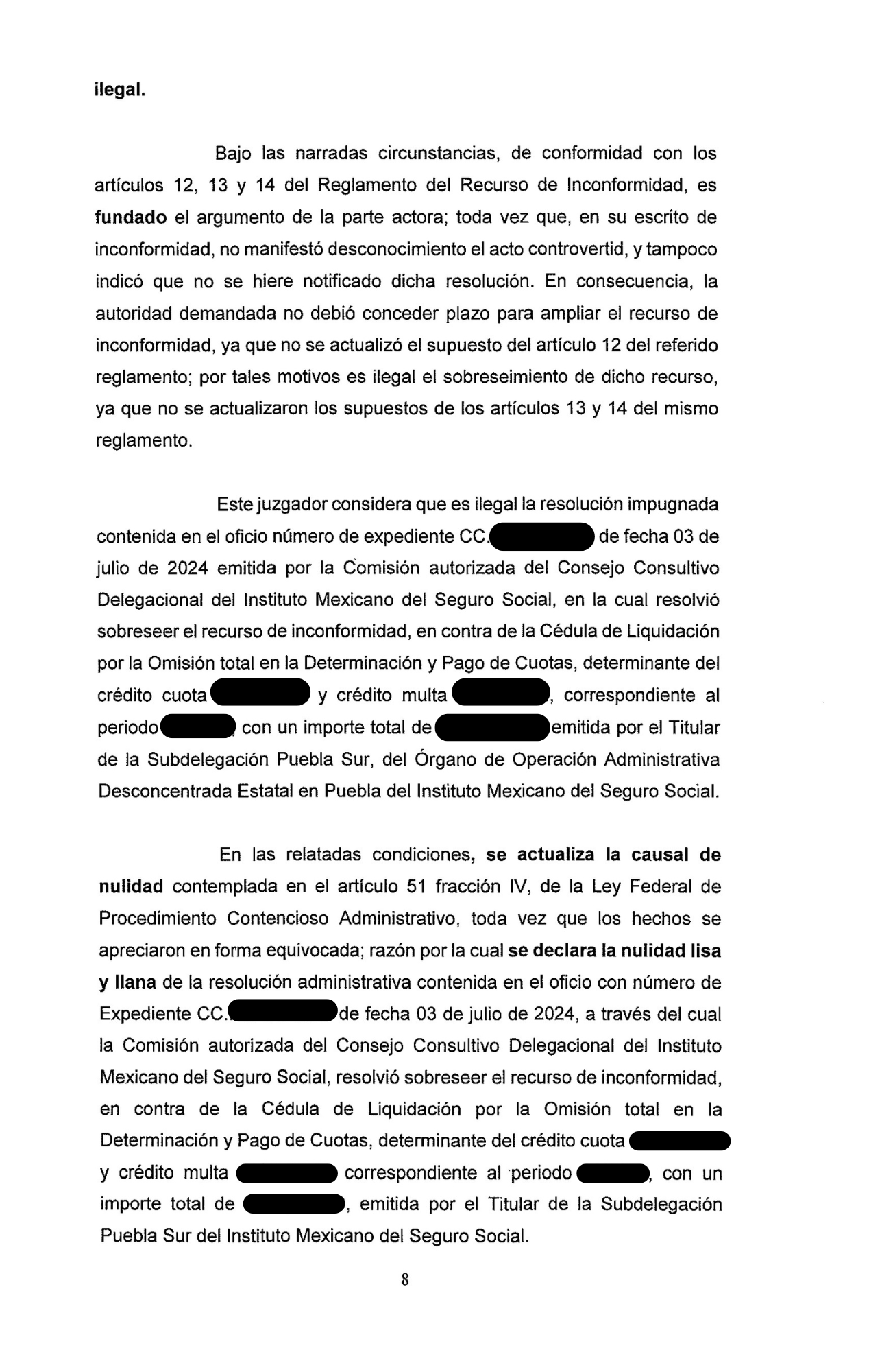 En el caso que nos ocupa, la autoridad emisora de la resolución impugnada, el Consejo Consultivo Delegacional del Órgano de Operación Administrativa Desconcentrada Estatal en Puebla de --------------------------, al resolver el recurso de inconformidad interpuesto por mi representada, determinó sobreseerlo con base en la actualización de una supuesta causal de improcedencia. Dicha determinación, contenida en la resolución de fecha tres de julio de dos mil veinticuatro, recaída al expediente CC.PUE. --------, se sustenta de manera medular en una fundamentación que resulta a todas luces indebida y, por tanto, ilegal.